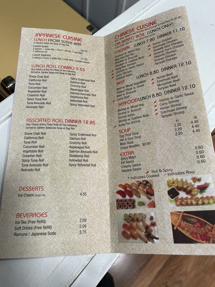 The menu features enticing options like the Lunch Sashimi, boasting an elegant selection of fish for just $12.65, perfect for sushi aficionados. If Chinese comfort food is more your style, indulge in dishes like Mongolian Beef or General Tso's Chicken, both priced around $8.90 to $9.90. Customers rave about the Hawaiian roll, a standout on the sushi menu, and the highly praised Hot and Sour Soup.